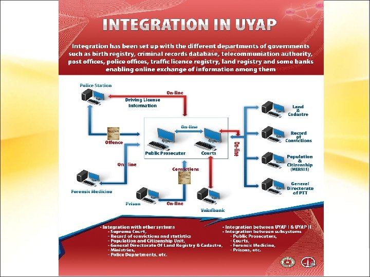 Integration Scope Integration between UYAP I & UYAP II Integration between subsystems – – Public Prosecuters, Courts, Forensic Medicine, Prisons, etc. Integration with other systems – – – Supreme Court, Record of convictions and statistics Population and Citizenship Unit, General Directorate Of Land Registry & Cadastre, Ministries, Police Departments, etc. Population and Citizenship (MERNİS) Record of Convictiond Police Supreme Courts Administrative Enforcement-Bank. Law Forensic Medicine Prisons Prosecuters UYAP II UYAP I Constitutional Court Gendarmery Council of state Supreme Court of Public Accounts Ministries Land & Cadastre Apart from all judicial organisations which are fully integrated internally, the number external institutions that are integrated in UYAP has exceeded 27