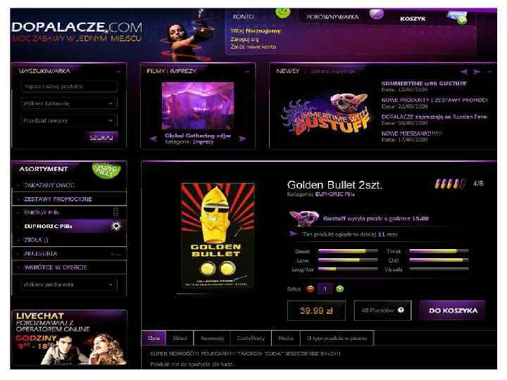 DOPALACZE. COM Opis działania produktu „kolekcjonerskiego” Golden Bullet: „. . . Produkt kolekcjonerski, który nie jest do spożycia. Golden Bullet 2 szt. w klaserze ma dla mnie tą samą wartość mentalną, co Purple Headphone Blister 3 szt. . Czas wkładania do klasera, to około 2 h. Klaser zaczyna wyglądać należycie po 1 h. Gdy na niego patrzę, czuję że żyję i zaczynam czuć muzykę. Następnego dnia zapomniałem, że go nabyłem. Na koniec warto napomknąć, że do klasera lepiej wkładać pojedynczo i odczekać 30 min. z wkładaniem kolejnych do klasera. . . ”