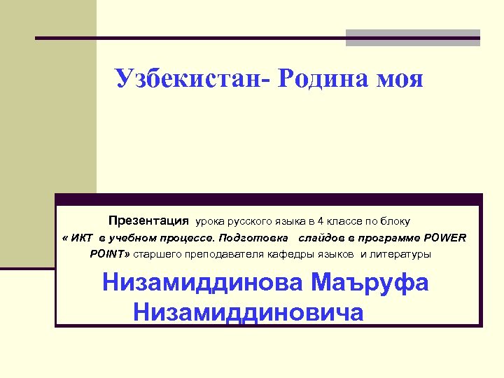 Узбекистан- Родина моя Презентация урока русского языка в 4 классе по блоку « ИКТ в учебном процессе. Подготовка слайдов в программе POWER POINT» старшего преподавателя кафедры языков и литературы Низамиддинова Маъруфа Низамиддиновича