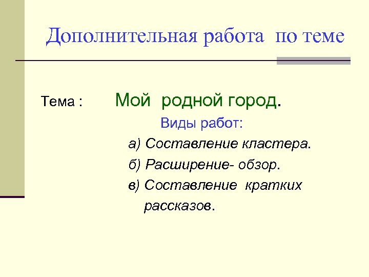 Дополнительная работа по теме Тема : Мой родной город. Виды работ: а) Составление кластера. б) Расширение- обзор. в) Составление кратких рассказов.