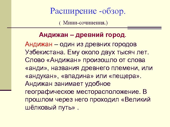 Расширение -обзор. ( Мини-сочинения. ) Андижан – древний город. Андижан – один из древних городов Узбекистана. Ему около двух тысяч лет. Слово «Андижан» произошло от слова «анди» , названия древнего племени, или «андукан» , «впадина» или «пещера» . Андижан занимает удобное географическое месторасположение. В прошлом через него проходил «Великий шёлковый путь» .