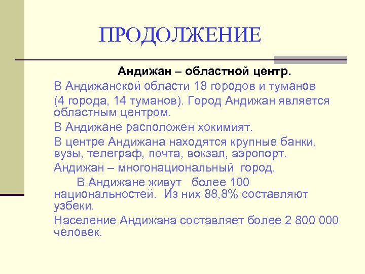 ПРОДОЛЖЕНИЕ Андижан – областной центр. В Андижанской области 18 городов и туманов (4 города, 14 туманов). Город Андижан является областным центром. В Андижане расположен хокимият. В центре Андижана находятся крупные банки, вузы, телеграф, почта, вокзал, аэропорт. Андижан – многонациональный город. В Андижане живут более 100 национальностей. Из них 88, 8% составляют узбеки. Население Андижана составляет более 2 800 000 человек.