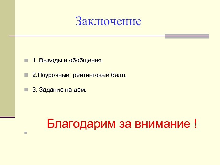 Заключение n 1. Выводы и обобщения. n 2. Поурочный рейтинговый балл. n 3. Задание на дом. Благодарим за внимание ! n