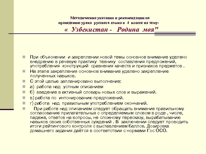 Методические указания и рекомендации по проведению урока русского языка в 4 классе на тему: « Узбекистан - Родина моя" n n n n При объяснении и закреплении новой темы основное внимание уделено внедрению в речевую практику технику составления предложений, употребления конструкций сравнения качеств и признаков предметов. На этапе закрепления основное внимание уделено закреплению полученных навыков. С этой целью запланировано выполнение: а) работа над устным описанием б) введение в активный словарь новых слов и выражений. в) работа по интонированию предложений. г) работа над правильным употреблением окончаний. При работе над описанием следует обращать внимание правильному согласованию прилагательных с определяемым словом в роде , числе, падеже, ответов на вопросы, не сложному пересказу, вырабатыванию навыков своих собственных суждений. В заключении следует проводить итоги рейтингового контроля с выставлением баллов. Дозировка домашнего задания даётся в соответствии с нормами Гос ОСО.