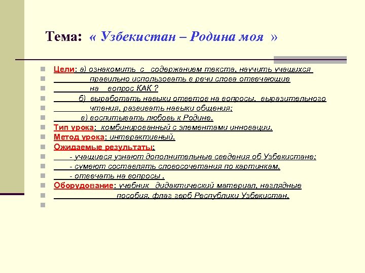 Тема: « Узбекистан – Родина моя » n n n n Цели: а) ознакомить с содержанием текста, научить учащихся правильно использовать в речи слова отвечающие на вопрос КАК ? б) выработать навыки ответов на вопросы, выразительного чтения, развивать навыки общения; в) воспитывать любовь к Родине. Тип урока: комбинированный с элементами инновации. Метод урока: интерактивный. Ожидаемые результаты: - учащиеся узнают дополнительные сведения об Узбекистане; - сумеют составлять словосочетания по картинкам. - отвечать на вопросы. Оборудование: учебник дидактический материал, наглядные пособия, флаг герб Республики Узбекистан.