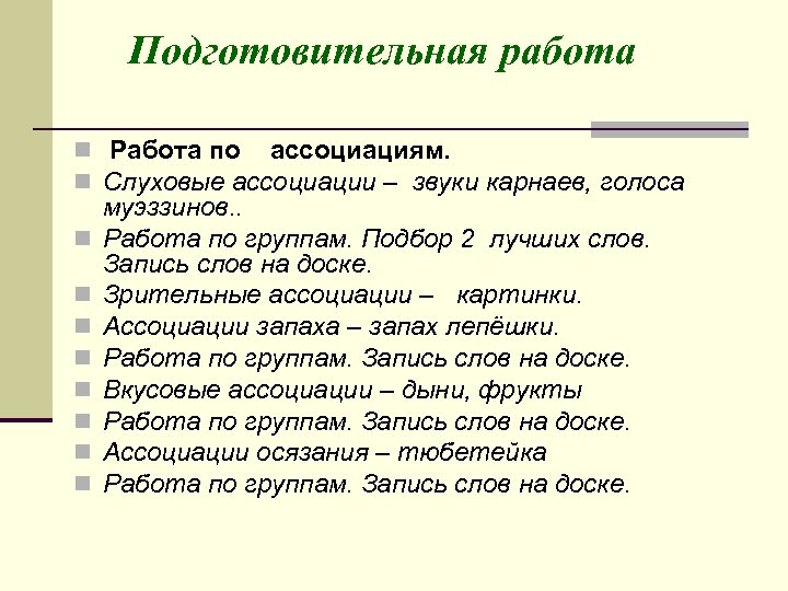 Подготовительная работа n Работа по ассоциациям. n Слуховые ассоциации – звуки карнаев, голоса n n n n муэззинов. . Работа по группам. Подбор 2 лучших слов. Запись слов на доске. Зрительные ассоциации – картинки. Ассоциации запаха – запах лепёшки. Работа по группам. Запись слов на доске. Вкусовые ассоциации – дыни, фрукты Работа по группам. Запись слов на доске. Ассоциации осязания – тюбетейка Работа по группам. Запись слов на доске.