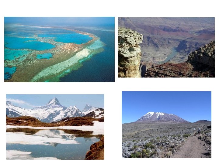 Seznam světového dědictví (151 zemí) - 704 památek kulturních (např. Versailles, Stonehenge, Velká čínská zeď, mírový památník v Hirošimě, hist. jádra Vídně, Salzburku, Krakova, Říma, opera v Sydney) - 180 památek přírodních (např. Bernské Alpy ve Švýcarsku, Kilimandžáro, Velký bariérový útes, National park Serengeti, National park Islas Galapagos, Grand Canyon) - 27 památek smíšených (např. Kakadu National Park, kláštery Meteora, Macchu Picchu)