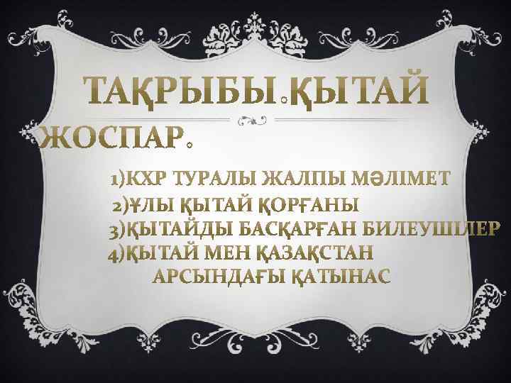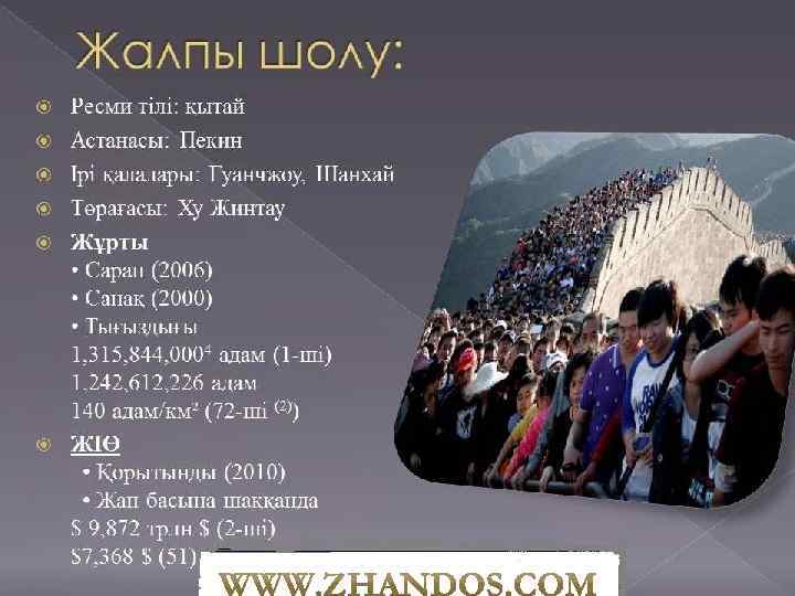 v Қытай Халық Республикасы (қыт. дәст. 中華人民共和國, жеңілд. 中华人 民共和国, пиньинь: Zhōnghuá Rénmín Gònghéguó) — Азия құрылығында орналасқан мемлекет. v Халық саны бойынша, әлемдегі 1 -ші мемлекет (1, 3 млрд санынан астам, халық көпшілігі — этникалық қытайлықтар, өз атауы — хән); жер аумағы бойынша Ресей және Канададан кейінгі 3 -ші орында. 1949 жылы Қытай Халық Республикасы жарияланғаннан бері елді Қытай Коммунистік партиясы билеуде. Ресми түрде сегіз партия болса да, ҚХР-сын бір партиялы, авторитарлық елдер қатарына жатқызады. 14 мемлекетпен шектеседі: Ауғанстан, Бутан, Мианма, Үндістан, Қазақстан, Қырғызстан, Лаос, Моңғолия, Непал, ҚХДР, Пәкістан, Ресей, Тәжікстан және Вьетнам Социалистік Республикасы. v
