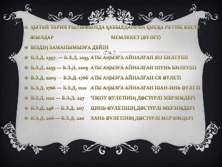 v Біздің заманымыз v 220 — 264 Вэй әулеті v 265 — 420 Цзинь әулеті (Батыс Цзинь: 265 — 316, Шығыс Цзинь: 317 — 420) v 420 — 479 Сун әулеті v 479 — 501 Ци әулеті v 502 — 556 Лян әулеті v 557 — 588 Чэнь әулеті v 589 — 618 Суй әулеті v 618 — 907 Тан әулеті v 907 — 959 Бес әулеттің заманы v 960— 1279 Сун әулеті v 1280 — 1368 Юань әулеті (моңғол) v 1368 — 1644 Мин әулеті v 1644 — 1911 Цин әулеті (манчжур) v 1912 — 1949 Қытай мемлекеті v 1949 ж. 30 қыркүйегі Қытай Халық Республикасы