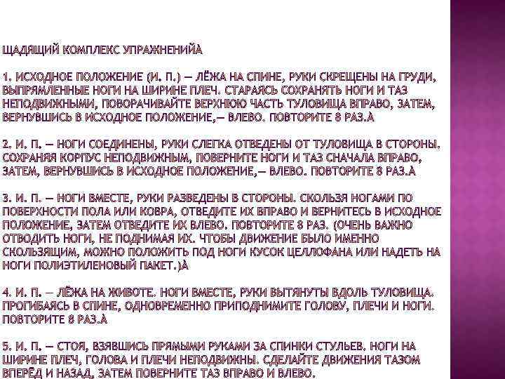 Упражнения щадящего комплекса многим могут показаться довольно простыми. Но это кажущаяся простота. Они настолько продуманны и проверены практикой, что при ежедневном выполнении способны творить чудеса. В этом легко убедиться, посещая занятия Валентина Ивановича Дикуля. Люди, жалующиеся на частые боли в спине, ослабленные болезнями, сгорбленные, избегавшие физических нагрузок, со временем избавляются от болей, наращивают «мышечный корсет» , приобретают хорошую осанку и вкус к физическим тренировкам.