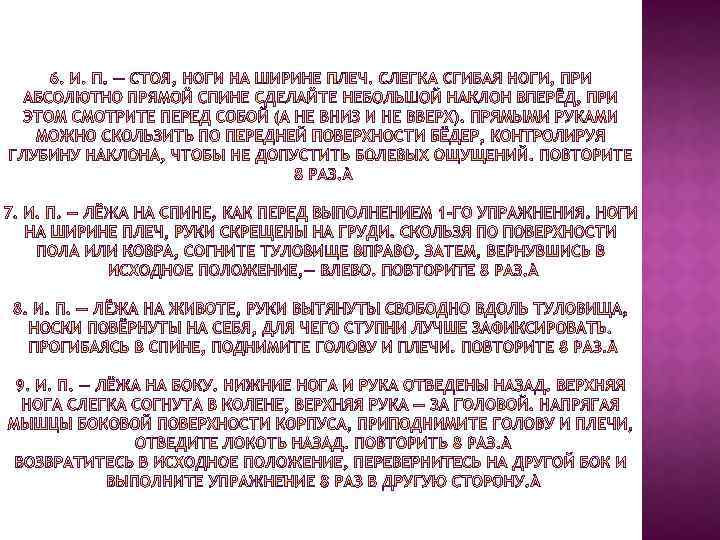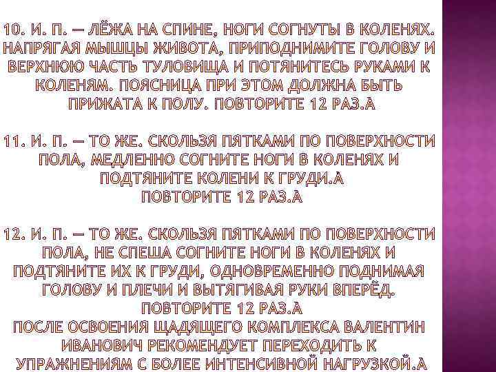 Главный принцип системы Дикуля таков: тренировка должна быть систематической с возрастающей нагрузкой, но не через боль. Как он говорит, «едва касаясь боли» . Это означает, что если где-то, в каком-то месте появилась боль, то напряжение мышц нужно сразу же ослабить или уменьшить амплитуду движений. Если после этого дискомфорт не проходит, лучше прервать занятия до следующего раза.