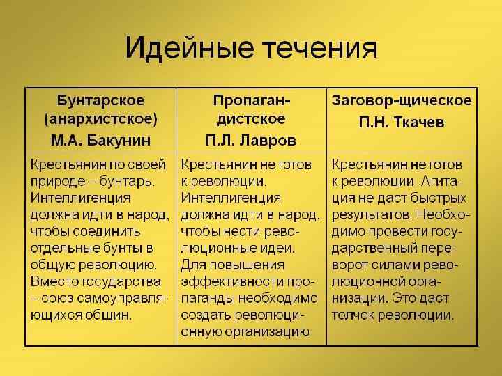 У истоков народничества стояли Герцен и Чернышевский. В народничестве сложилось 3 течения: 1)Пропагандистское 2)Бунтарское 3)Заговорщическое
