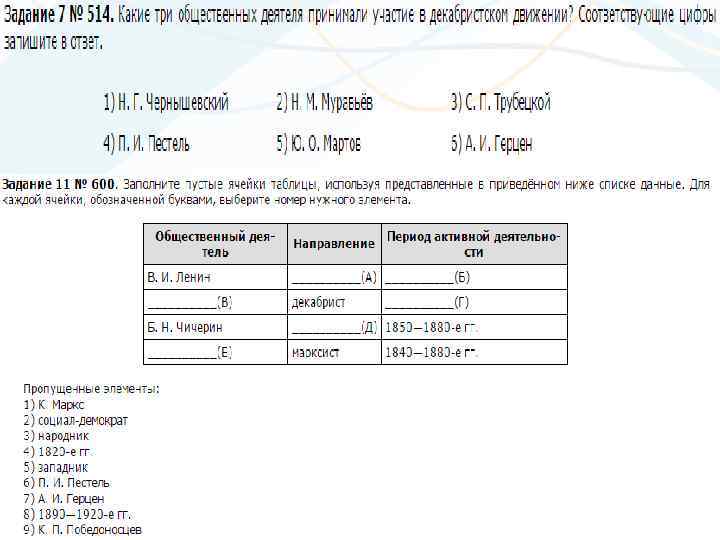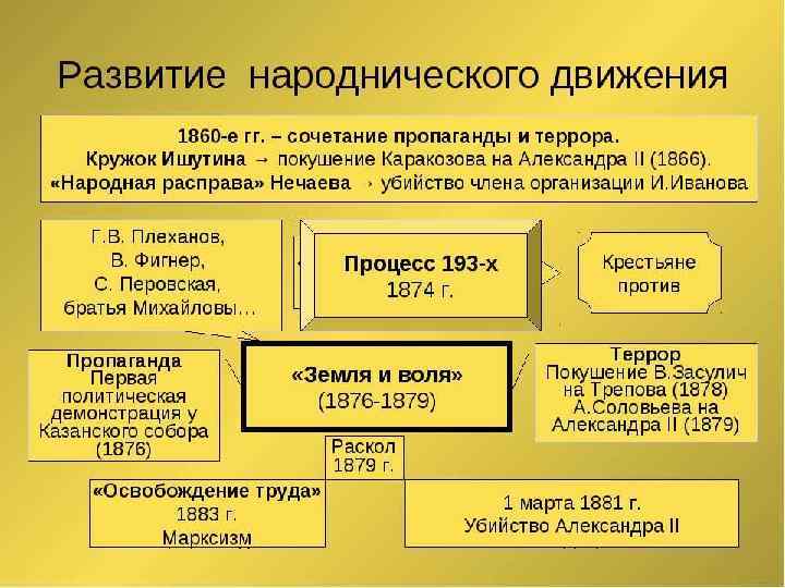 1861 — 1864 гг. Деятельность первой организации “Земля и воля”. 1874 г. Первое массовое “хождение в народ”. 1875 г. Создание Южнороссийского союза рабочих. 1876 — 1879 гг. Деятельность народнической организации “Земля и воля”. 1878 г. Создание “Северного союза русских рабочих”. 1879 г. Образование организаций “Народная воля” и “Черный передел” 1883 г. Создание группы “Освобождение труда”. 1885 г. Морозовская стачка. 1895 г. Создание “Союза борьбы за освобождение рабочего класса” 1898 г. I съезд РСДРП. 1903 г. II съезд РСДРП.