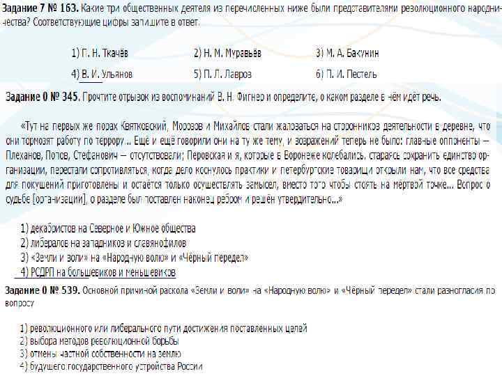 В августе 1879 г. “Земля и воля” распалась на две организации: “Народную волю” (1879 — 1882 гг. ) и “Черный передел” (1879 — 1884 гг. ). Чернопередельцы (среди наиболее активных членов — Г. В. Плеханов, П. Б. Аксельрод, Л. Г. Дейч, В. И. Засулич и др. ) выступали против тактики террора, за проведение широкой пропагандистской работы в массах крестьян. В дальнейшем часть чернопередельцев во главе с Г. В. Плехановым отошла от народничества и встала на позиции марксизма.