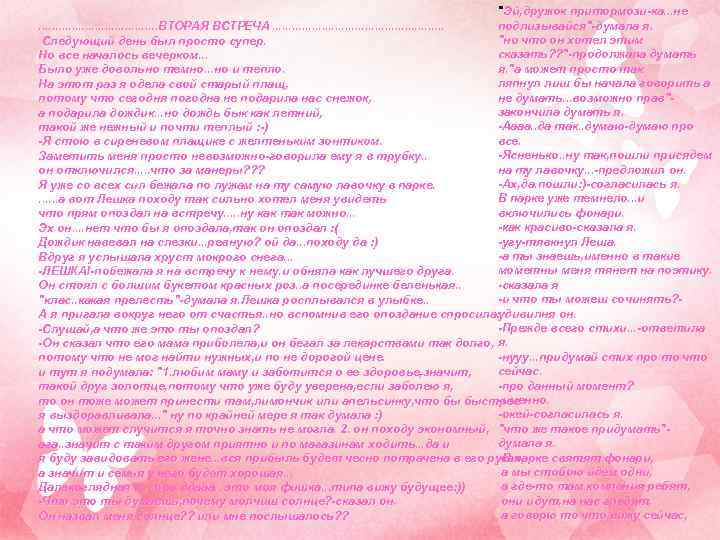 "Эй, дружок притормози-ка. . . не подлизывайся"-думала я. . . . . ВТОРАЯ ВСТРЕЧА. . . . "но что он хотел этим Следующий день был просто супер. сказать? ? "-продолжала думать Но все началось вечерком. . . я. "а может просто так Было уже довольно темно. . . но и тепло. ляпнул лиш бы начала говорить а На этот раз я одела свой старый плащ, не думать. . . возможно прав"потому что сегодня погодна не подарила нас снежок, закончила думать я. а подарила дождик. . . но дождь бык как летний, -Аааа. . да так. . думаю-думаю про такой же нежный и почти теплый : -) все. -Я стою в сиреневом плащике с желтеньким зонтиком. -Ясненько. . ну так, пошли присядем Заметить меня просто невозможно-говорила ему я в трубку. . на ту лавочку. . . -предложил он. он отключился. . . что за манеры? ? ? -Ах, да. пошли: )-согласилась я. Я уже со всех сил бежала по лужам на ту самую лавочку в парке. Ах, да. пошли: )-согласилась В парке уже темнело. . . и. . . а вот Лешка походу так сильно хотел меня увидеть включились фонари. что прям опоздал на встречу. . . ну как так можно. . . -как красиво-сказала я. Эх он. . нет что бы я опоздала, так он опоздал : ( -угу-тявкнул Леша. Дождик навевал на слезки. . . ревную? ой да. . . походу да : ) слезки. . . ревную? -а ты знаешь, именно в такие Вдруг я услышала хруст мокрого снега. . . мометны меня тянет на поэтику. -ЛЕШКА!-побежала я на встречу к нему. и обняла как лучшего друга. -сказала я Он стоял с болшим букетом красных роз. . а посерединке беленькая. . -и что ты можеш сочинять? "клас. . какая прелесть"-думала я. Лешка росплывался в улыбке. . удивилня он. А я пригала вокруг него от счастья. . но вспомнив его опоздание спросила: -Прежде всего стихи. . . -ответила -Слушай, а что же это ты опоздал? -Он сказал что его мама приболела, и он бегал за лекарствами так долго, я. -нууу. . . придумай стих про то что потому что не мог найти нужных, и по не дорогой цене. сейчас. и тут я подумала: "1. любим маму и заботится о ее здоровье, значит, , здоровье, значит -про данный момент? такой друг золотце, потому что уже буду уверена, если заболею я, -именно. то он тоже может принести там, лимончик или апельсинку, что бы быстрее -окей-согласилась я. я выздоравливала. . . " ну по крайней мере я так думала : ) а что может случится я точно знать не могла. 2. он походу экономный, "что же такое придумать"думала я. ага. . значит с таким другом приятно и по магазинам ходить. . . да и -В парке святят фонари, я буду завидовать его жене. . . вся прибыль будет чесно потрачена в его руках, а мы стобою йдем одни, а значит и семья у него будет хорошая. . . а где-то там компания ребят, Далекоглядная я. . ооо. ддааа. . . это моя фишка. . . типа вижу будущее: )) они идут, на нас гледят, -Что это ты думаешь, почему молчиш солнце? -сказал он. гледят, а говорю то что вижу сейчас, Он назвал меня солнце? ? или мне послышалось? ?