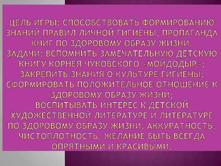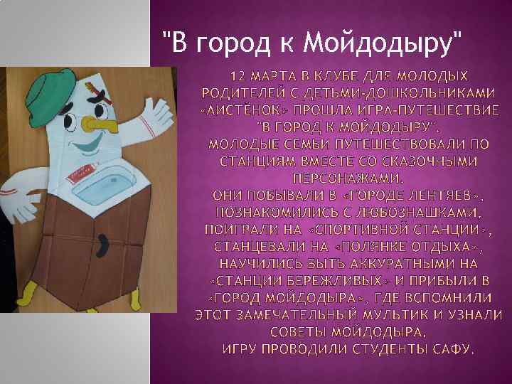 Внимание! Мы въезжаем в город Чистоты и Порядка. Это самый чистый город. В нем живут самые аккуратные дети. Здесь везде чистота и порядок: хорошо жить, где нет лентяев и грязнуль. А самое главное, что в этом городе живет сам Мойдодыр. На этой станции мы посмотрели отрывок мультфильма и услышали советы Мойдодыра. От радости мы станцевали заключительный танец.