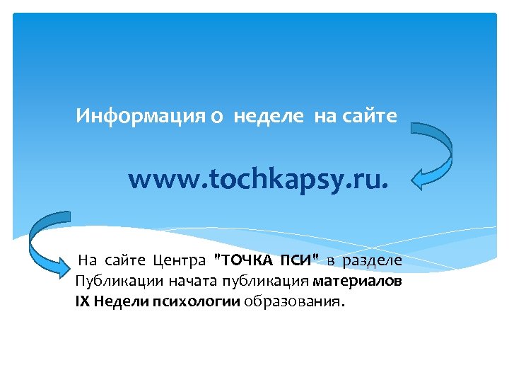 Информация о неделе на сайте www. tochkapsy. ru. На сайте Центра "ТОЧКА ПСИ" в разделе Публикации начата публикация материалов IX Недели психологии образования.
