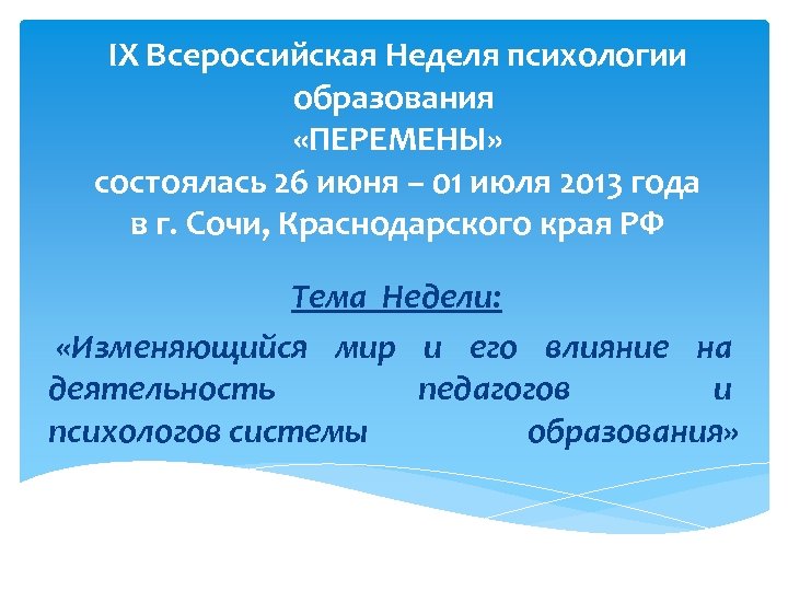IX Всероссийская Неделя психологии образования «ПЕРЕМЕНЫ» состоялась 26 июня – 01 июля 2013 года в г. Сочи, Краснодарского края РФ Тема Недели: «Изменяющийся мир и его влияние на деятельность педагогов и психологов системы образования»