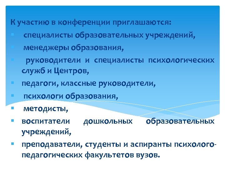 К участию в конференции приглашаются: § специалисты образовательных учреждений, § менеджеры образования, § руководители и специалисты психологических служб и Центров, § педагоги, классные руководители, § психологи образования, § методисты, § воспитатели дошкольных образовательных учреждений, § преподаватели, студенты и аспиранты психологопедагогических факультетов вузов.