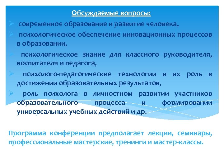 Ø Ø Ø Обсуждаемые вопросы: современное образование и развитие человека, психологическое обеспечение инновационных процессов в образовании, психологическое знание для классного руководителя, воспитателя и педагога, психолого-педагогические технологии и их роль в достижении образовательных результатов, роль психолога в личностном развитии участников образовательного процесса и формировании универсальных учебных действий и др. Программа конференции предполагает лекции, семинары, профессиональные мастерские, тренинги и мастер-классы.