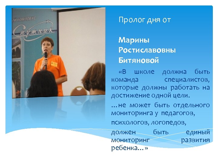 Пролог дня от Марины Ростиславовны Битяновой «В школе должна быть команда специалистов, которые должны работать на достижение одной цели. …не может быть отдельного мониторинга у педагогов, психологов, логопедов, должен быть единый мониторинг развития ребенка…»