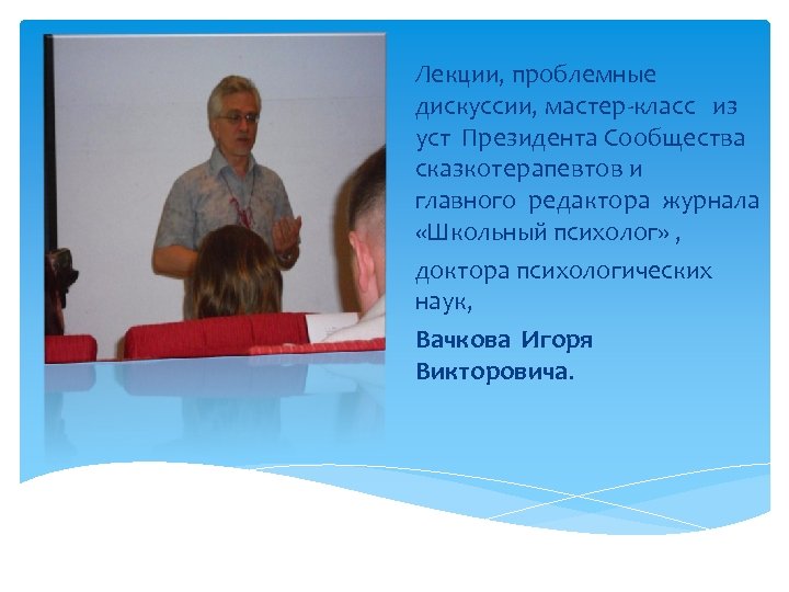 Лекции, проблемные дискуссии, мастер-класс из уст Президента Сообщества сказкотерапевтов и главного редактора журнала «Школьный психолог» , доктора психологических наук, Вачкова Игоря Викторовича.