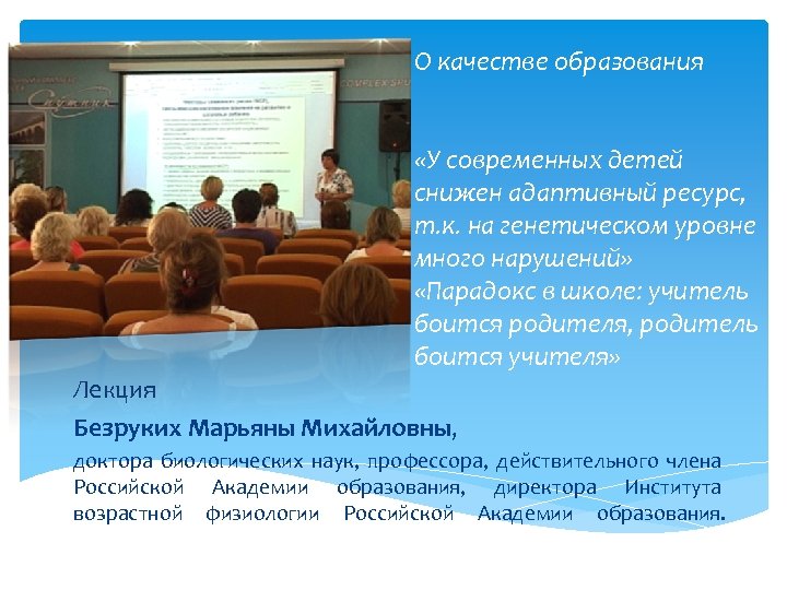 О качестве образования «У современных детей снижен адаптивный ресурс, т. к. на генетическом уровне много нарушений» «Парадокс в школе: учитель боится родителя, родитель боится учителя» Лекция Безруких Марьяны Михайловны, доктора биологических наук, профессора, действительного члена Российской Академии образования, директора Института возрастной физиологии Российской Академии образования.