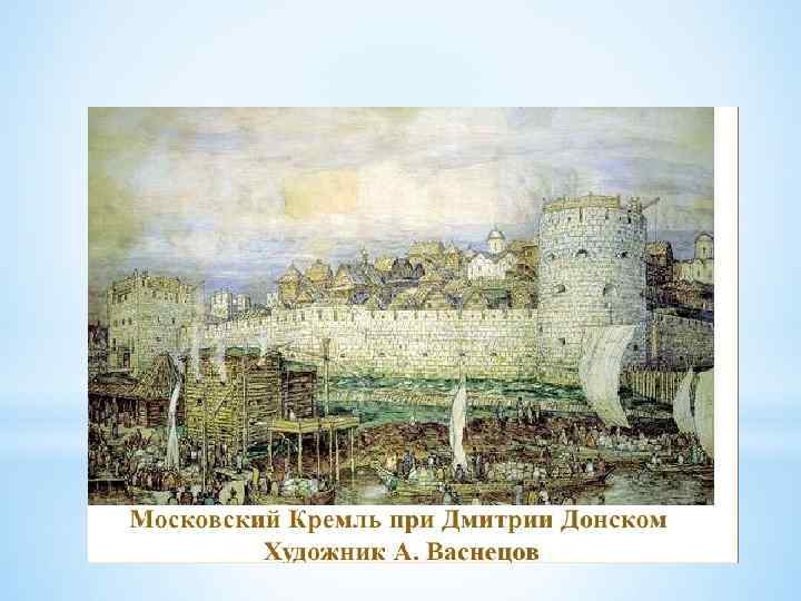 Васнецов Аполлинарий Михайлович (1856 -1933): Московский Кремль при Иване Калите. 1921 Частокол из дуба, установленный напротив кремлёвской стены, построен специально, в целях безопасности Кремля. На холме расположен княжеский терем, соединённый срубами из дерева, а к нему установлена высокая лестница. По левую сторону от княжеского двора изображён Успенский собор, выполненный из камня, а чуть поодаль, построен Архангельский собор.