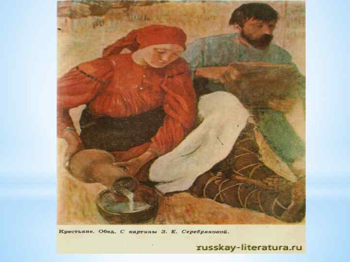 * Героиня – «величавая славянка» , во внешнем облике которой воплотились народные представления о настоящей красавице: * Есть женщины в русских селеньях С спокойною важностью лиц, С красивою силой в движеньях, С походкой, со взглядом цариц, – Их разве слепой не заметит, А зрячий о них говорит: «Пройдет – словно солнце осветит! Посмотрит – рублем одарит!» * Русская женщина у Некрасова обладает настоящим душевным богатством. В ее образе поэтом показан человек высоких нравственных качеств, не теряющий веру, не сломленный никакими горестями. Некрасов воспевает ее стойкость в жизненных испытаниях, гордость, достоинство, заботу о семье и детях. Судьба Дарьи – нелегкая доля крестьянки, которая взяла на себя всю мужскую работу, и от этого погибла. Ее судьба воспринимается как типичная участь русской женщины.