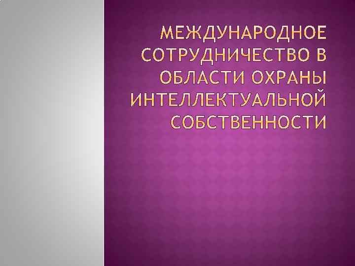 1) Парижская конвенция по охране промышленной собственности 1883 г. (для СССР и затем для России Конвенция вступила в силу с 1 июля 1965 г. ); 2) Всемирная (Женевская) конвенция об авторском праве 1952 г. (вступила в силу в 1968 г. ); 3) Бернская конвенция об охране литературных и художественных произведений 1886 г. (действует на территории РФ с 1995 г. ); 4) Договор о патентной кооперации 1970 г. (вступил в силу для СССР в 1978 г. ); 5) Соглашение о сотрудничестве в области охраны авторского права и смежных прав 1993 г. (Россия совместно с Азербайджаном, Арменией, Беларусью, Казахстаном, Киргизией, Молдовой, Таджикистаном, Туркменией, Узбекистаном и Украиной; вступило в силу в том же году); 6) Евразийская патентная конвенция 1994 г. (страны бывшего СССР, вступил в силу в 1995 г. ); 7) Конвенция, учреждающая Всемирную организацию интеллектуальной собственности 1967 г. (вступил в силу для СССР в 1973 г. ); 8) Конвенция об охране интересов производителей фонограмм 1971 г. (действует на территории РФ с 1995 г. ); 9) Международная конвенция по охране новых сортов растений 1961 г. (Россия присоединилась в 1997 г. ); 10) Международная (Римская) конвенция об охране прав исполнителей, изготовителей фонограмм и вещательных организаций 1961 г. (вступила в силу в 2003 г. ).