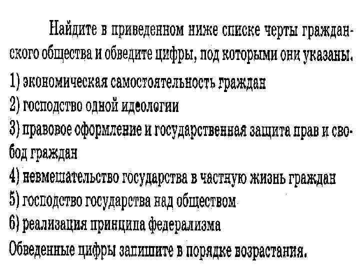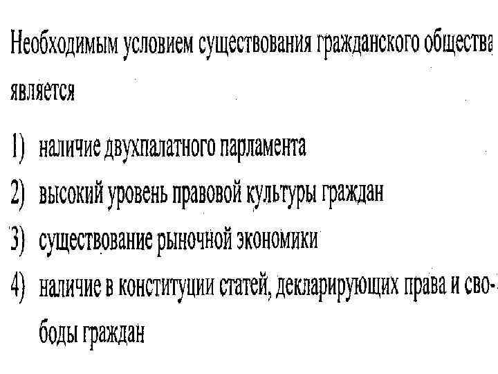 К гражданскому обществу не относится 1) ассоциация банкиров 3) семья 2) министерство культуры 4) негосударственные СМИ К признакам гражданского общества не относится 1) возможность контролировать государство 2) реальность исполнения прав и обязанностей 3) презрительное отношение к законам 4) развитая структура общественных организаций Верны ли следующие суждения о гражданском обществе? А. Гражданское общество является главным каналом связи граждан с государством. Б. Гражданское общество защищает граждан и их объединения от незаконного вмешательства государства в их жизнь и деятельность. 1) верно только А 3) верны оба суждения 2) верно только Б 4) оба суждения неверны