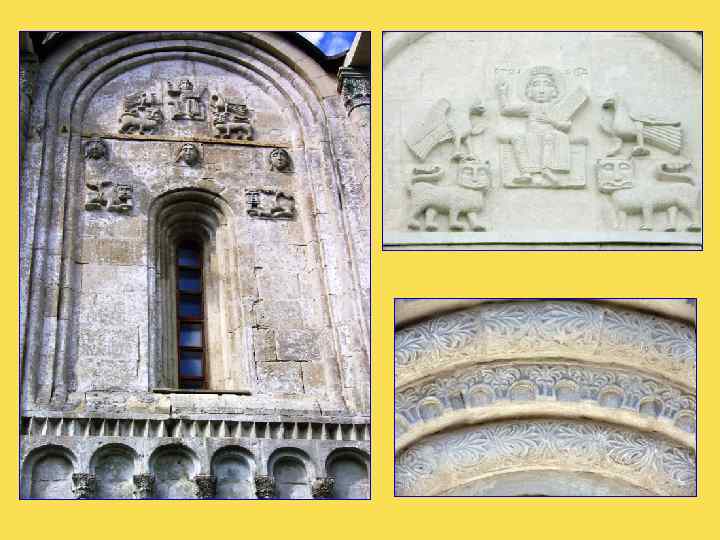Стены храма украшает традиционная для владимиро-суздальского зодчества белокаменная резьба. На всех трех фасадах повторяется одна и та же композиция: царь Давид-псалмопевец, сидящий на троне. По обеим сторонам от него симметрично расположены два голубя, а под ними - фигуры львов. Еще ниже - три женские маски с волосами, заплетенными в косы. Такие же маски помещены и на боковых частях фасада храм как бы опоясывается ими. Эти маски символизируют Богородицу и присутствуют на всех владимирских храмах той эпохи.
