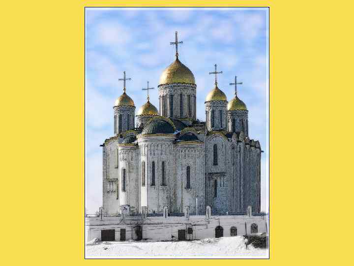 По высоте Успенский собор во Владимире равнялся Софии Киевской. На постройку храма князь выделил десятую долю своих доходов. Храм был сложен из белого камняизвестняка, а его центральная глава покрыта «червонным золотом» . От стен Успенского собора берет свое начало и знаменитая белокаменная резьба древнерусских храмов. Именно на фасадах Успенского собора впервые появились резные белокаменные композиции