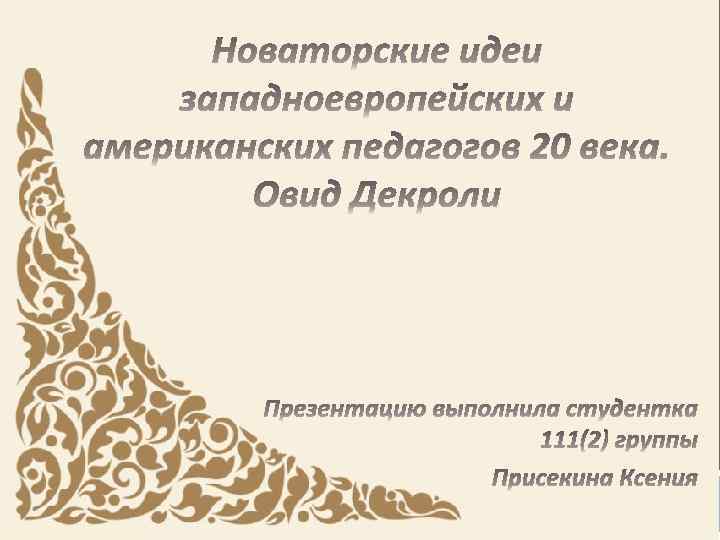 Овид Декроли (1871— 1932) — прогрессивный бельгийский педагог, видный представитель движения за “новое воспитание”, врач и психолог. В 1901 г. в окрестностях Брюсселя Декроли открыл институт. для умственно отсталых детей, а вскоре, в 1907 г. , в Брюсселе — школу для нормальных детей от 3 до 18 лет, которая продолжает существовать и поныне.