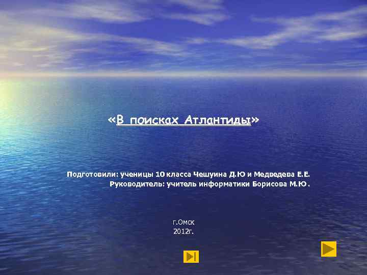 «В поисках Атлантиды» Подготовили: ученицы 10 класса Чешуина Д. Ю и Медведева Е. Е. Руководитель: учитель информатики Борисова М. Ю. г. Омск 2012 г.
