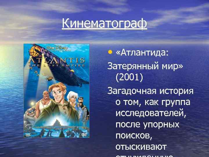 Кинематограф • «Атлантида: Затерянный мир» (2001) Загадочная история о том, как группа исследователей, после упорных поисков, отыскивают