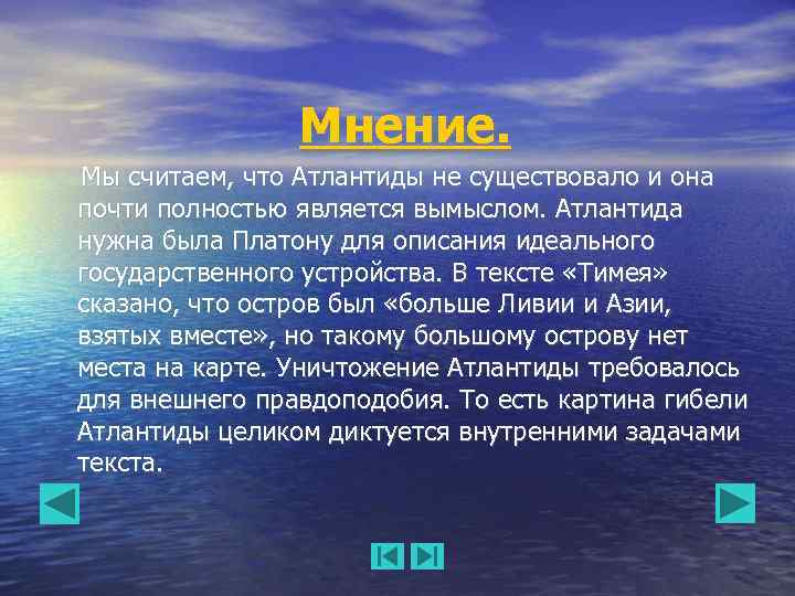Мнение. Мы считаем, что Атлантиды не существовало и она почти полностью является вымыслом. Атлантида нужна была Платону для описания идеального государственного устройства. В тексте «Тимея» сказано, что остров был «больше Ливии и Азии, взятых вместе» , но такому большому острову нет места на карте. Уничтожение Атлантиды требовалось для внешнего правдоподобия. То есть картина гибели Атлантиды целиком диктуется внутренними задачами текста.