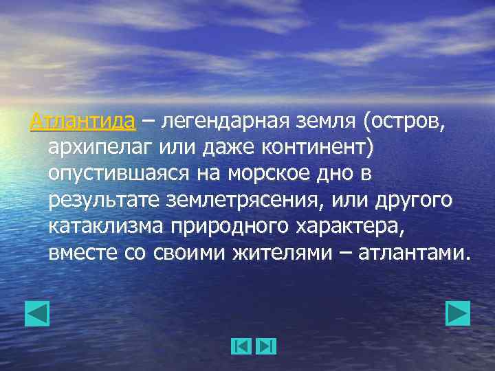 Атлантида – легендарная земля (остров, архипелаг или даже континент) опустившаяся на морское дно в результате землетрясения, или другого катаклизма природного характера, вместе со своими жителями – атлантами.