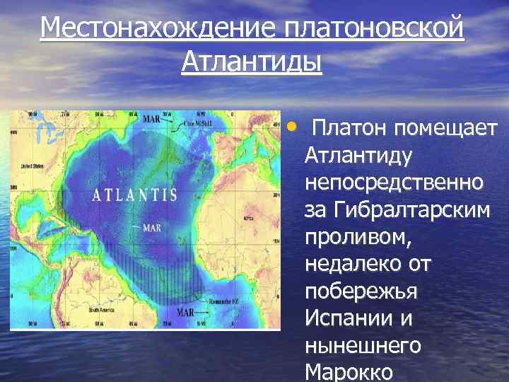 Местонахождение платоновской Атлантиды • Платон помещает Атлантиду непосредственно за Гибралтарским проливом, недалеко от побережья Испании и нынешнего Марокко