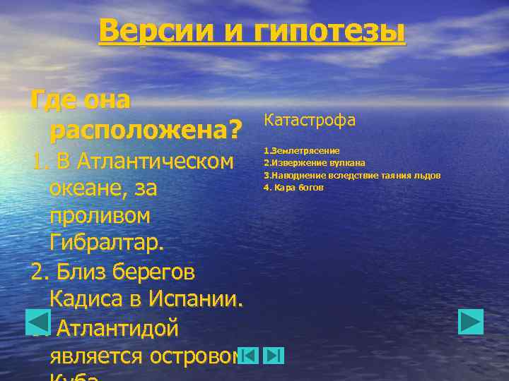Версии и гипотезы Где она расположена? 1. В Атлантическом океане, за проливом Гибралтар. 2. Близ берегов Кадиса в Испании. 3. Атлантидой является островом Катастрофа 1. Землетрясение 2. Извержение вулкана 3. Наводнение вследствие таяния льдов 4. Кара богов