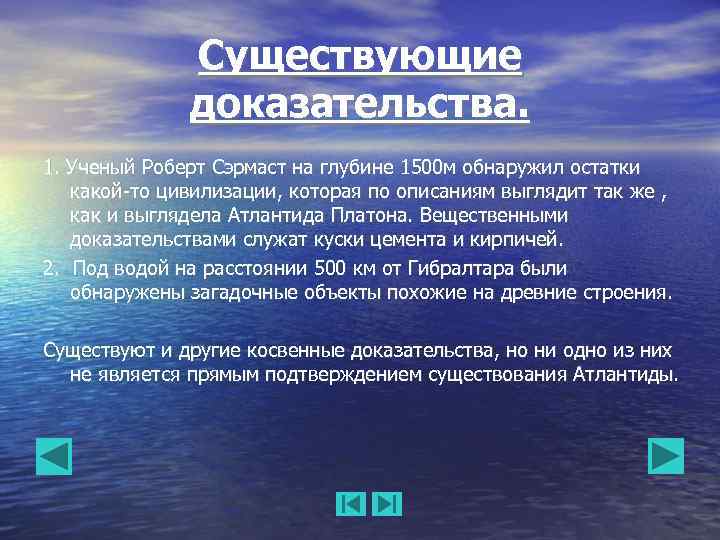 Существующие доказательства. 1. Ученый Роберт Сэрмаст на глубине 1500 м обнаружил остатки какой-то цивилизации, которая по описаниям выглядит так же , как и выглядела Атлантида Платона. Вещественными доказательствами служат куски цемента и кирпичей. 2. Под водой на расстоянии 500 км от Гибралтара были обнаружены загадочные объекты похожие на древние строения. Существуют и другие косвенные доказательства, но ни одно из них не является прямым подтверждением существования Атлантиды.