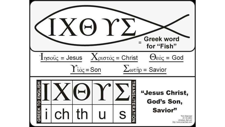 «Иисус Христос Сын Божий Спаситель» (᾿Ιησοῦς Χριστὸς Θεοῦ Υἱὸς Σωτήρ) «Мы маленькие рыбки, ведомые нашим Ихтис, мы рождаемся в воде и можем спастись не иначе как пребывая в воде» (Тертуллиан. О Крещении, 1)