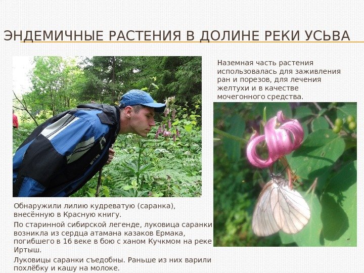 ЭНДЕМИЧНЫЕ РАСТЕНИЯ В ДОЛИНЕ РЕКИ УСЬВА Обнаружили лилию кудреватую (саранка), внесённую в Красную книгу. По старинной сибирской легенде, луковица саранки возникла из сердца атамана казаков Ермака, погибшего в 16 веке в бою с ханом Кучкмом на реке Иртыш. Луковицы саранки съедобны. Раньше из них варили похлёбку и кашу на молоке. Наземная часть растения использовалась для заживления ран и порезов, для лечения желтухи и в качестве мочегонного средства.