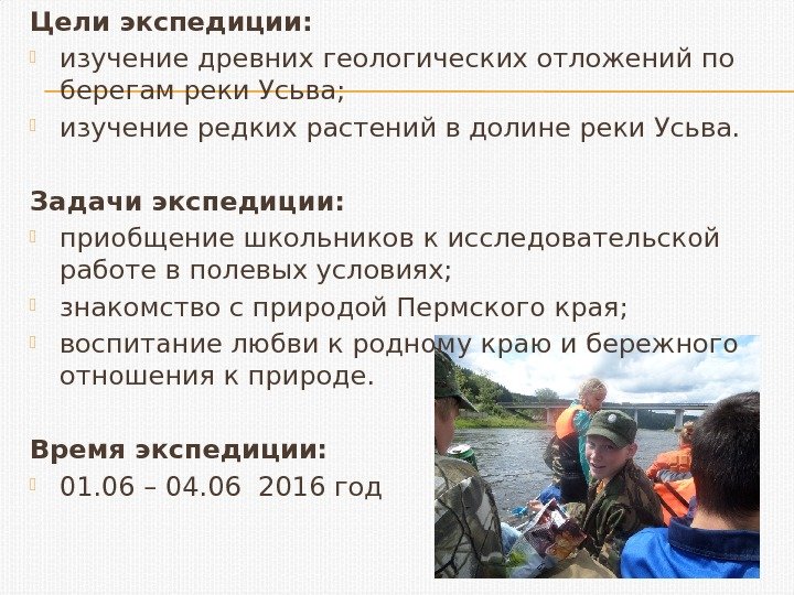 Цели экспедиции: изучение древних геологических отложений по берегам реки Усьва; изучение редких растений в долине реки Усьва. Задачи экспедиции: приобщение школьников к исследовательской работе в полевых условиях; знакомство с природой Пермского края; воспитание любви к родному краю и бережного отношения к природе. Время экспедиции: 01. 06 – 04. 06 2016 год