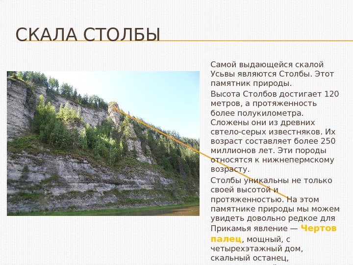 СКАЛА СТОЛБЫ Самой выдающейся скалой Усьвы являются Столбы. Этот памятник природы. Высота Столбов достигает 120 метров, а протяженность более полукилометра. Сложены они из древних свтело-серых известняков. Их возраст составляет более 250 миллионов лет. Эти породы относятся к нижнепермскому возрасту. Столбы уникальны не только своей высотой и протяженностью. На этом памятнике природы мы можем увидеть довольно редкое для Прикамья явление— Чертов палец , мощный, с четырехэтажный дом, скальный останец, расположенный между руслом реки и каменной стеной берегового утеса.