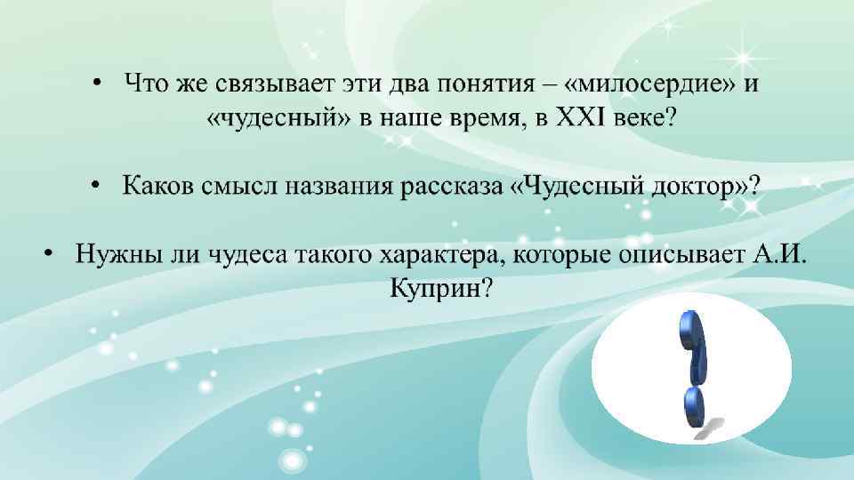 • Что же связывает эти два понятия – «милосердие» и «чудесный» в наше время, в XXI веке? • Каков смысл названия рассказа «Чудесный доктор» ? • Нужны ли чудеса такого характера, которые описывает А. И. Куприн?