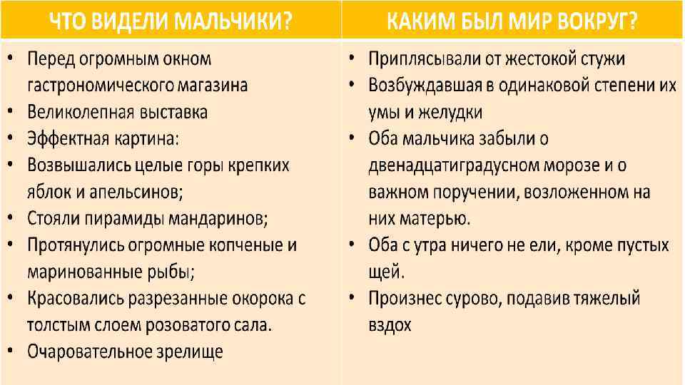 ЖИЗНЬ МАЛЬЧИКОВ Прекрасные магазины Сияющие елки Рысаки, мчавшиеся под своими синими и красными сетками Праздничное оживление толпы Веселый гул окриков и разговоров Разрумяненные морозом смеющиеся лица нарядных дам Праздничное ликование ЖИЗНЬ БОЛЬШОГО ГОРОДА Малолюднее и темнее становились улицы Кривые, узкие переулки. Покосившийся, ветхий дом, Мрачные, не освещенные косогоры Темный, обледенелый и грязный двор Грязная широкая постель Закоптелые, плачущие от сырости стены Мокрые отрепки Ужасный запах керосинового газа Детское грязное белье и крысы – настоящий запах нищеты.