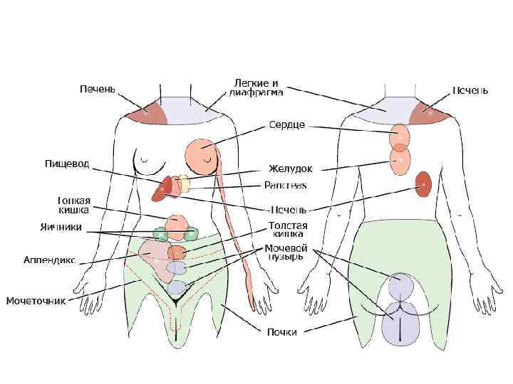 • Несколько иной механизм возникновения так называемой отраженной боли. Болевые сигналы от внутренних органов иногда приводят к болевым ощущениям не только в них, но и на некотором расстоянии от них в поверхностных областях тела. например, боли в сердце отражаются в груди и на медиальной поверхности руки. Формирование такого болевого ощущения всегда происходит на той части периферии, которая обслуживается тем же сегментом спинного мозга, что и пораженный внутренний орган (см. Захарьина — Геда зоны). Это обстоятельство используется в диагностических целях, поскольку взаимоотношения между внутренними органами и дерматомами известны.