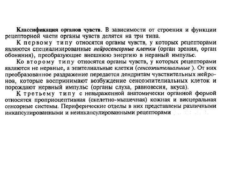 • Классификация анализаторов по характеру (модальности) ощущений: - Слуховой, - Вестибулярный, - Тактильный, - Проприорецепторы (рецепторы аппарата движения), - Барорецепторы (рецепторы давления) - Вкусовой, - Обонятельный, - Интерорецепторы сосудов, - Зрительный - Температурный - Болевой