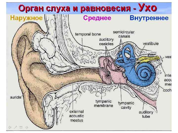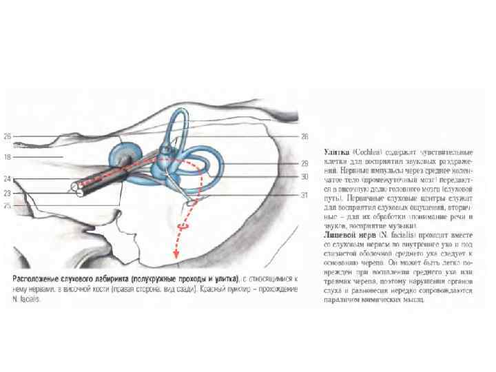 Слуховой анализатор Проводниковый отдел начинается с периферического биполярного нейрона, расположенного в спиральном ганглии улитки. Волокна слухового нерва заканчиваются на клетках ядер кохлеарного комплекса продолговатого мозга (второй нейрон). Затем после частичного перекреста волокна идут в медиальное коленчатое тело таламуса, где опять происходит переключение не третий нейрон, от которого информация поступает в кору. Корковый отдел слухового анализатора расположен в верхней части височной доли большого мозга.